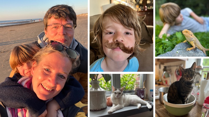 Das sind Lars, Cecilia, Nicolas und unser kleiner Streichelzoo: Die Katzengeschwister Susi und Pippa und Jack, Nicolas‘ Bartagame.